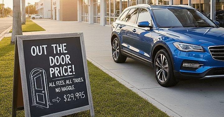 The out-the-door price is the final total cost of the vehicle. It includes the price of the car plus all required taxes and fees. This is the number that matters most because it reflects what you actually pay, not just what is advertised.